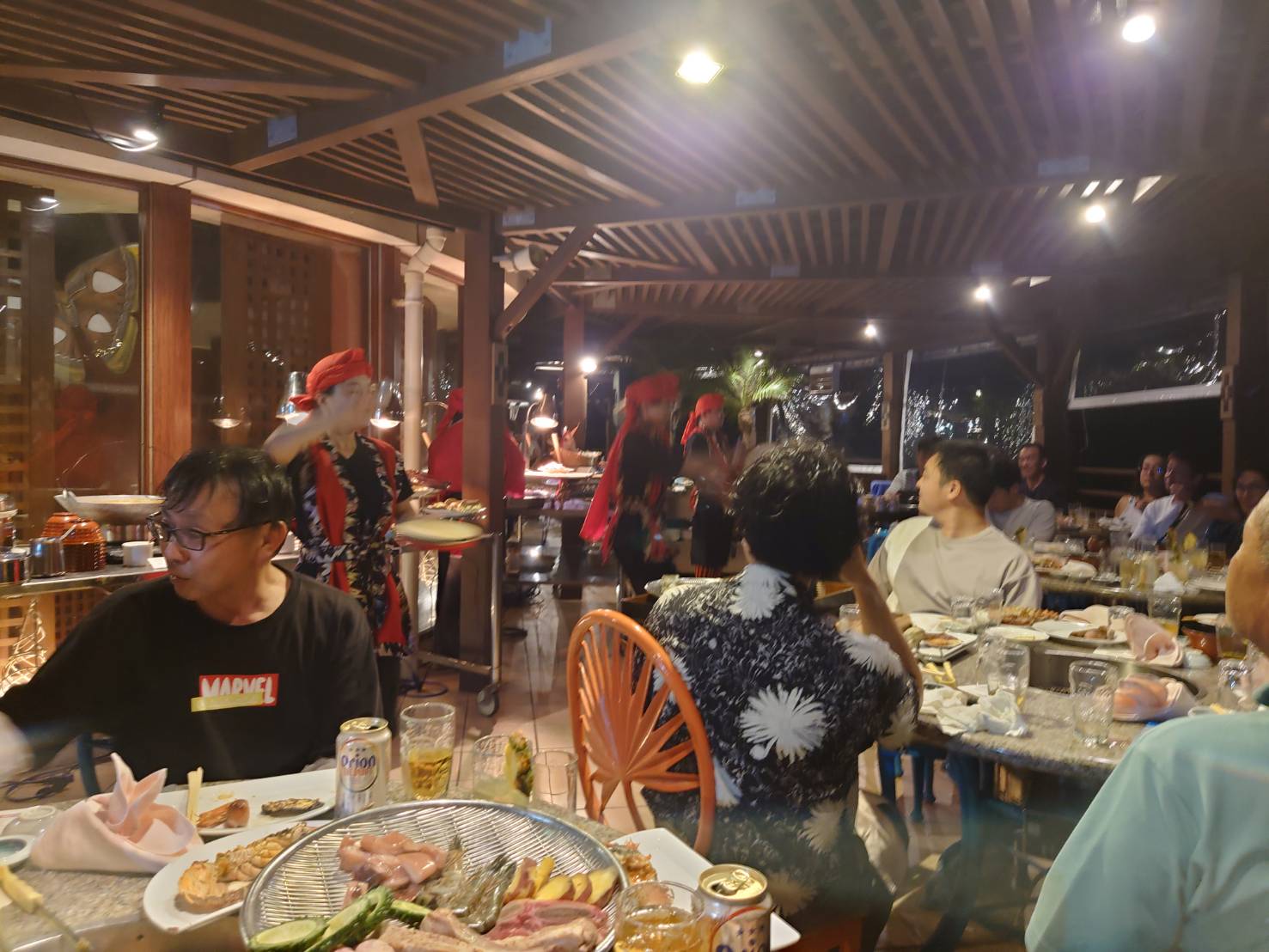 夜は屋外パーティ会場での夕食。海人焼き、てんぷら、海人汁など、沖縄の海の幸がずらり。