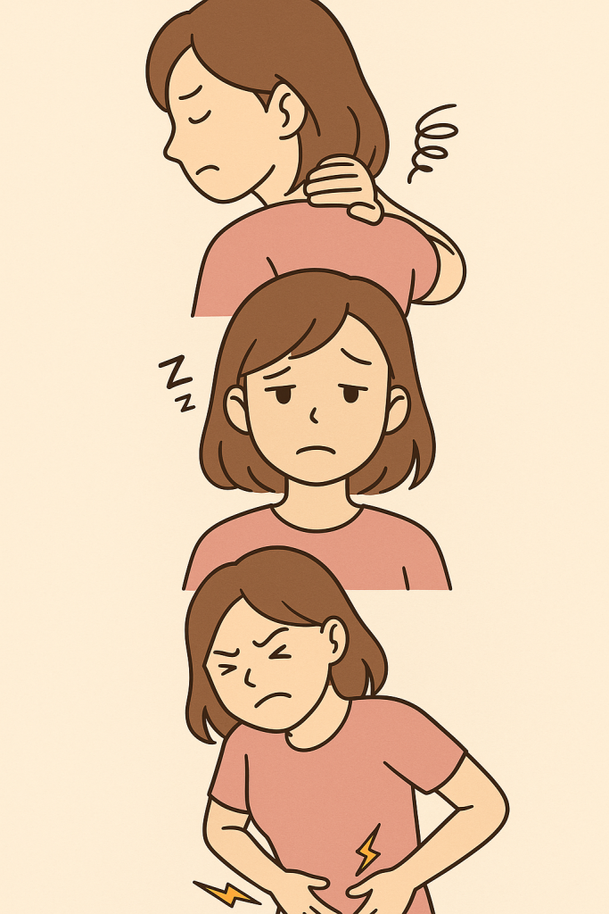 これらは、同じ姿勢でのデスクワークや冷え、ストレス、栄養の偏りなどが関係しています。